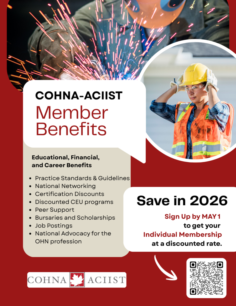 Membership Benefits CONNECTConnect with Occupational Health Professionals. Engage with the knowledge, experience and peer insight of COHNA’s wide range of members FINANCIAL SUPPORTApply for Scholarships to support continued professional education in Occupational Health.Receive certification support and discounts. CAREER OPPORTUNITIESExplore job postings and connect directly with employers who know the value of Occupational Health Professionals. Be acknowledged by your peers through our Award of Excellence. PROFESSIONAL DEVELOPMENTAccess free and discounted live webinars (3-4 annually) with CEU credits. Learn about disability case management, research, health promotion, professional practice, regulations, and more. GIVE BACKParticipate on committees, develop curriculum, mentor new professionals, or run for a leadership position to foster growth at a National level. BE A VOICE FOR CHANGEContribute to the future of the Occupational Health Nursing profession through advocacy within Canada’s political and regulatory systems. Become a Member