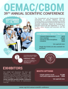 The Occupational and Environmental Medicine Association of Canada (OEMAC) and the Canadian Board of Occupational Medicine (CBOM) are excited to be back in person for the 39th Annual Scientific Conference. Attend the Conference in beautiful Victoria, BC from September 11-13, 2022 to learn, share, network and reconnect with the industry.